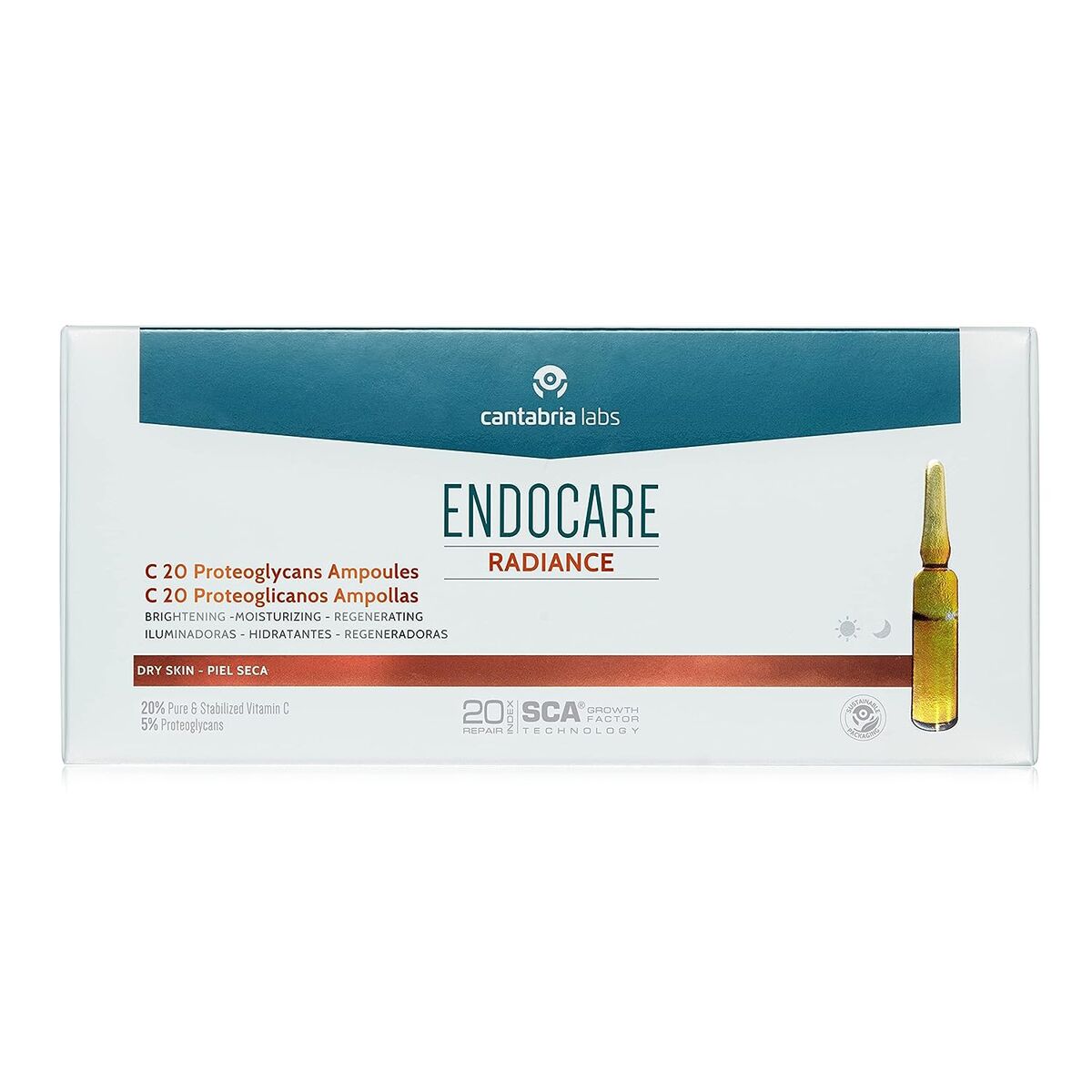 The Endocare Radiance Proteoglycans Ampoules are a cosmetic treatment specially designed for dry skin, combining effectiveness and advanced care in a convenient, dosed format. This product comes in a set of 30 ampoules of 2 ml each, offering a total of 200 ml of oil-free solution, ideal for those seeking intensive care without adding grease to the skin. Made in Spain, these ampoules contain a formula enriched with proteoglycans, essential natural components that help improve skin structure and firmness, promoting long-lasting hydration and a constant rejuvenating effect. Its oil-free composition increases tolerance even in sensitive or flaky skin, allowing quick absorption that leaves skin soft, radiant, and revitalized without a sticky feel. The ampoule format allows precise, dosed application that maximizes product preservation, ensuring effectiveness treatment after treatment. This concentrated care is suitable for unisex use and recommended for dry skin, aiming to restore the hydrolipidic balance and strengthen natural defense against premature aging signs or environmental damage. The Radiance C20 Proteoglycans line stands as an advanced solution in the cosmetic sector for those needing extra skin nutrition and radiance in a daily beauty routine. In short, these ampoules represent a technical and reliable option for specialized care with visible results and a practical, safe format for continued use.