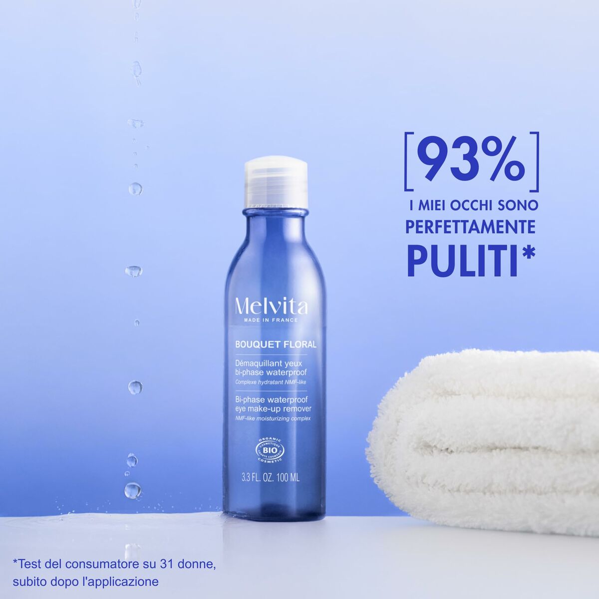 The BOUQUET FLORAL DETOX facial makeup remover from the Melvita brand is a product specially formulated for cleansing and removing makeup from the eye area, designed for women seeking an effective and gentle solution. It features a liquid biphasic texture that facilitates the removal of impurities and makeup residues, including waterproof products, without irritating the sensitive skin around the eyes. Made in France, it combines carefully selected ingredients such as Potassium sorbate and Ricinus communis (castor) oil, known for their soothing and natural preservative properties, contributing to a vegan and skin-friendly formula. Its 100 ml capacity makes it ideal for daily use, offering a practical and long-lasting experience. This makeup remover adapts to the specific needs of female skin, providing a deep cleanse that helps detoxify and refresh the eye area without drying it, promoting comfort and well-being after application. Additionally, its formulation based on natural ingredients reinforces confidence in its quality and safety, aligning with a conscious and sustainable care approach. In short, BOUQUET FLORAL DETOX stands as a reliable ally for effective facial hygiene, especially in the delicate eye area, combining French tradition and responsibility in cosmetic care.